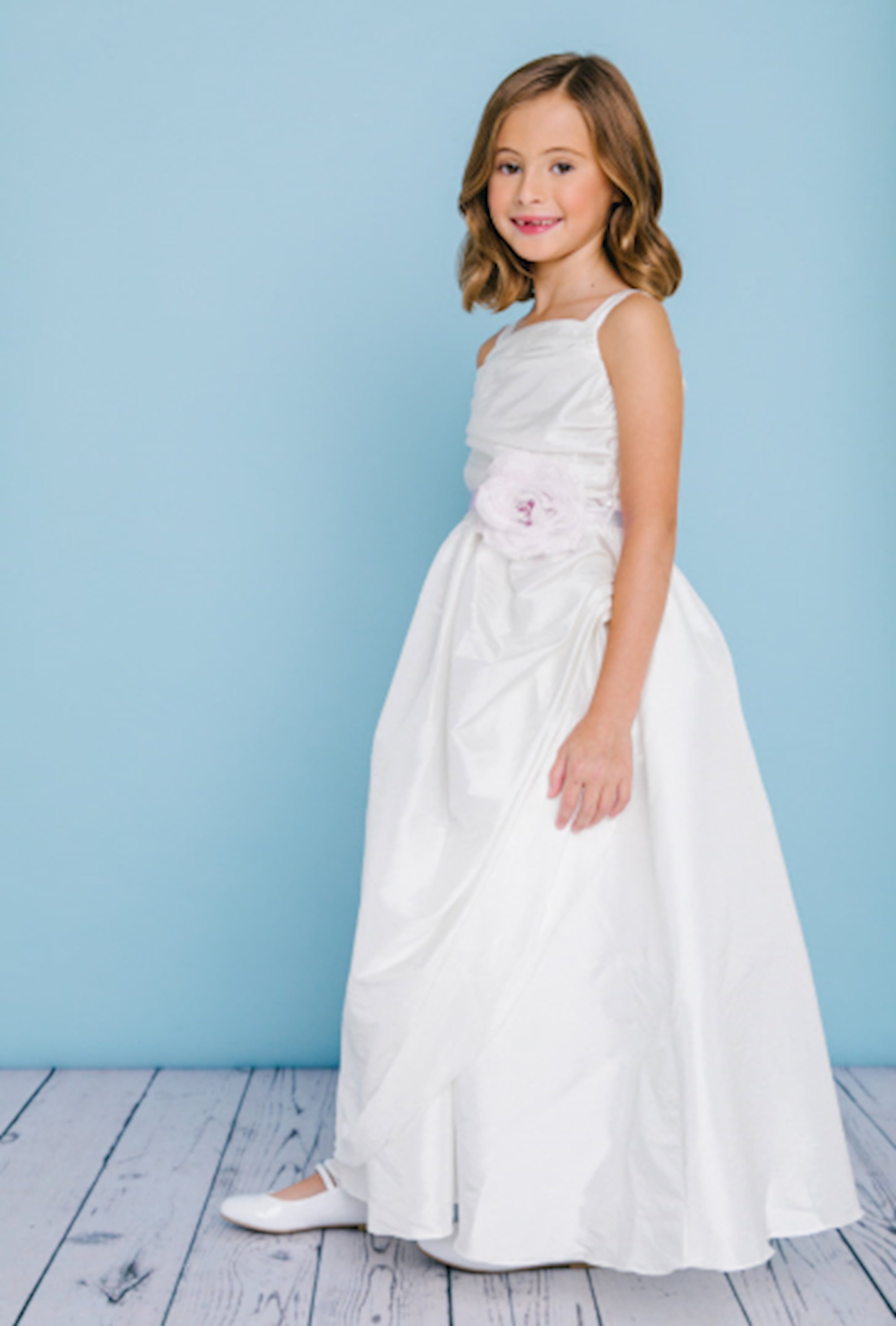 Style 5112 comes with a ruche bodice and a side sweeping skirt. The waist is accented with a ribbon and flower. Taffeta buttons cover the zipper.